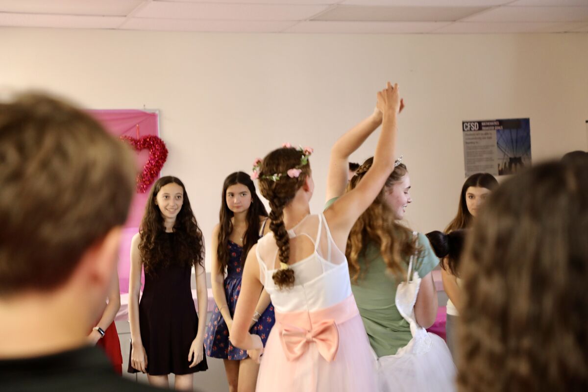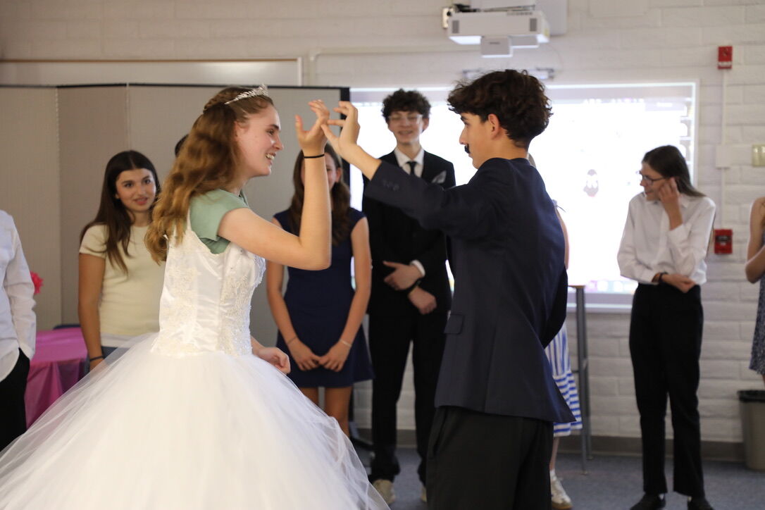El vals came next. Eleanor and Justin danced together as la corte de honor clapped along, Moussa drawing laughs with his stick-on bigote as he led his partner across the floor with exaggerated flair. The damas performed their baile sorpresa. Then many students joined in for a group line dance, the formal giving way to alegría as students spun each other around the room.