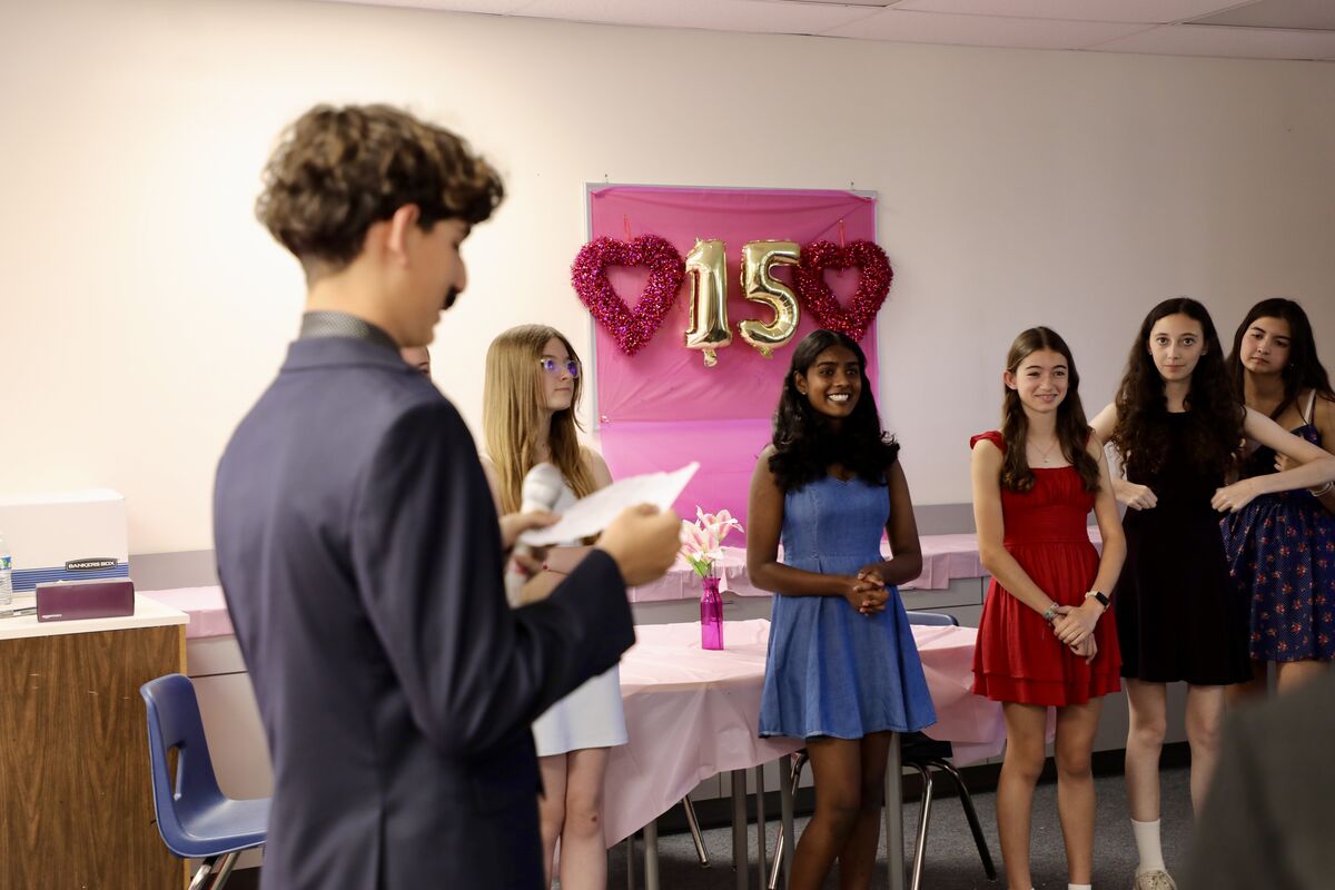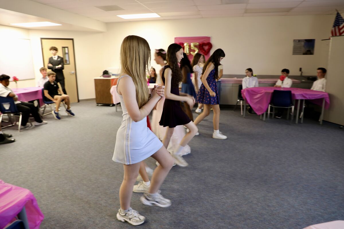 Señora Robles staged the event and announced each student by name and role as they walked in. Some entered individually, others in pairs. Eleanor arrived as la quinceañera. Justin served as her chambelán de honor. Moussa played el padre, Gigi la madre, and Isabelle represented la niñez, childhood itself. Nine pairs formed la corte de honor, the court of honor that accompanies the quinceañera through her celebration. Six damas prepared un baile sorpresa, a surprise dance, for the honoree. Then the rituals began.