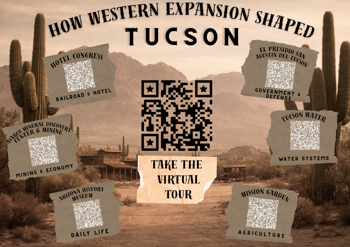 "Exploring Tucson: Students Trace the Paths of Expansion" asks students to step into the role of historians as they explore Tucson's history within the larger story of westward expansion. Over several months, students have researched local landmarks, examined primary sources, held artifacts, interviewed experts, and considered multiple perspectives on who built this city and at whose expense. Their final product: a public-facing city tour with student-created QR codes at real Tucson locations, featuring multimedia content and questions designed to prompt community members to think critically about how Tucson's growth was shaped by the arrival of settlers and the displacement of the people who were already here.