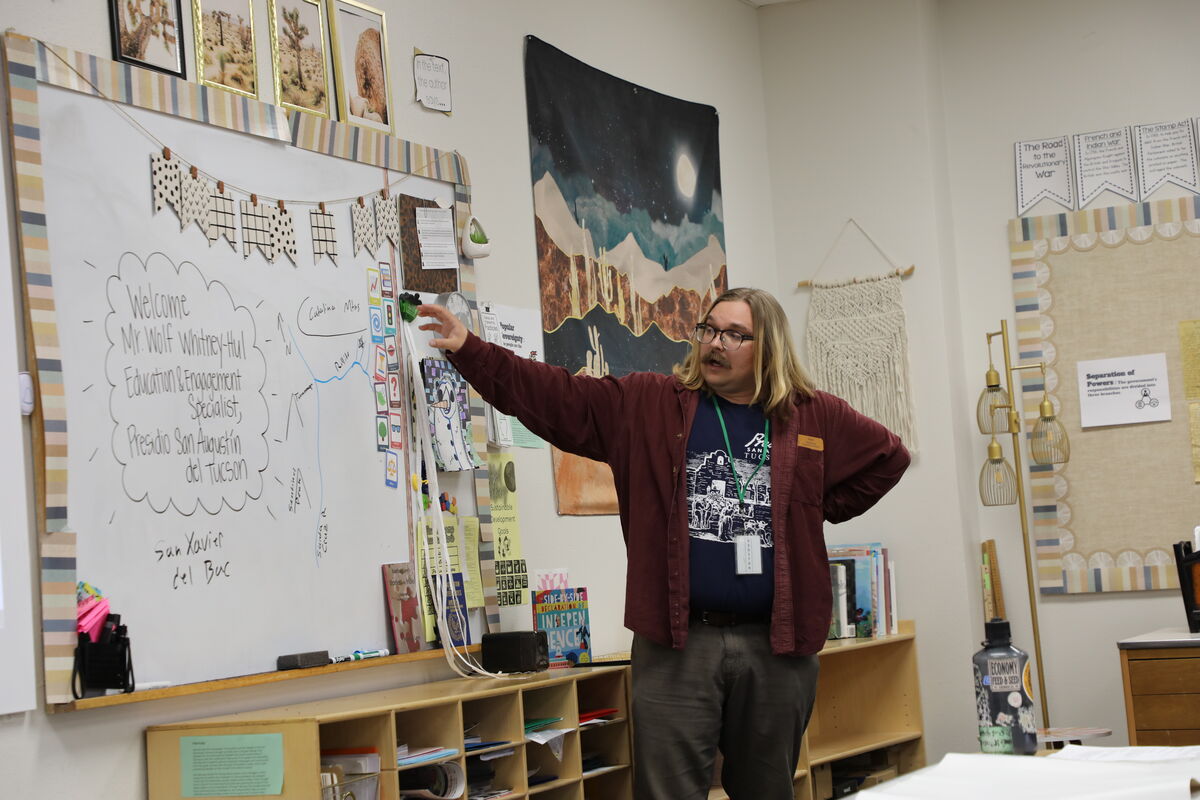 The Arizona Historical Society brought artifacts into the classroom, putting pieces of Tucson's past directly into students' hands. Mission Garden sent Abby Reinhart to explain how different cultures have grown food in Tucson across centuries, from indigenous gardens to Spanish gardens to a "tomorrow's garden" focused on sustainability. The Presidio San Agustín del Tucson Museum sent an archaeologist named Wolf to walk students through the Spanish colonization strategy and the construction of the fort that gave the city its shape. The Arizona History Museum prompted students to imagine daily life during westward expansion and the challenges families faced as they moved to the desert. Tucson Water, the Southern Arizona Transportation Museum, Hotel Congress, the University of Arizona Library, UA Special Collections, and the Pima County Library all contributed to student research and community engagement.